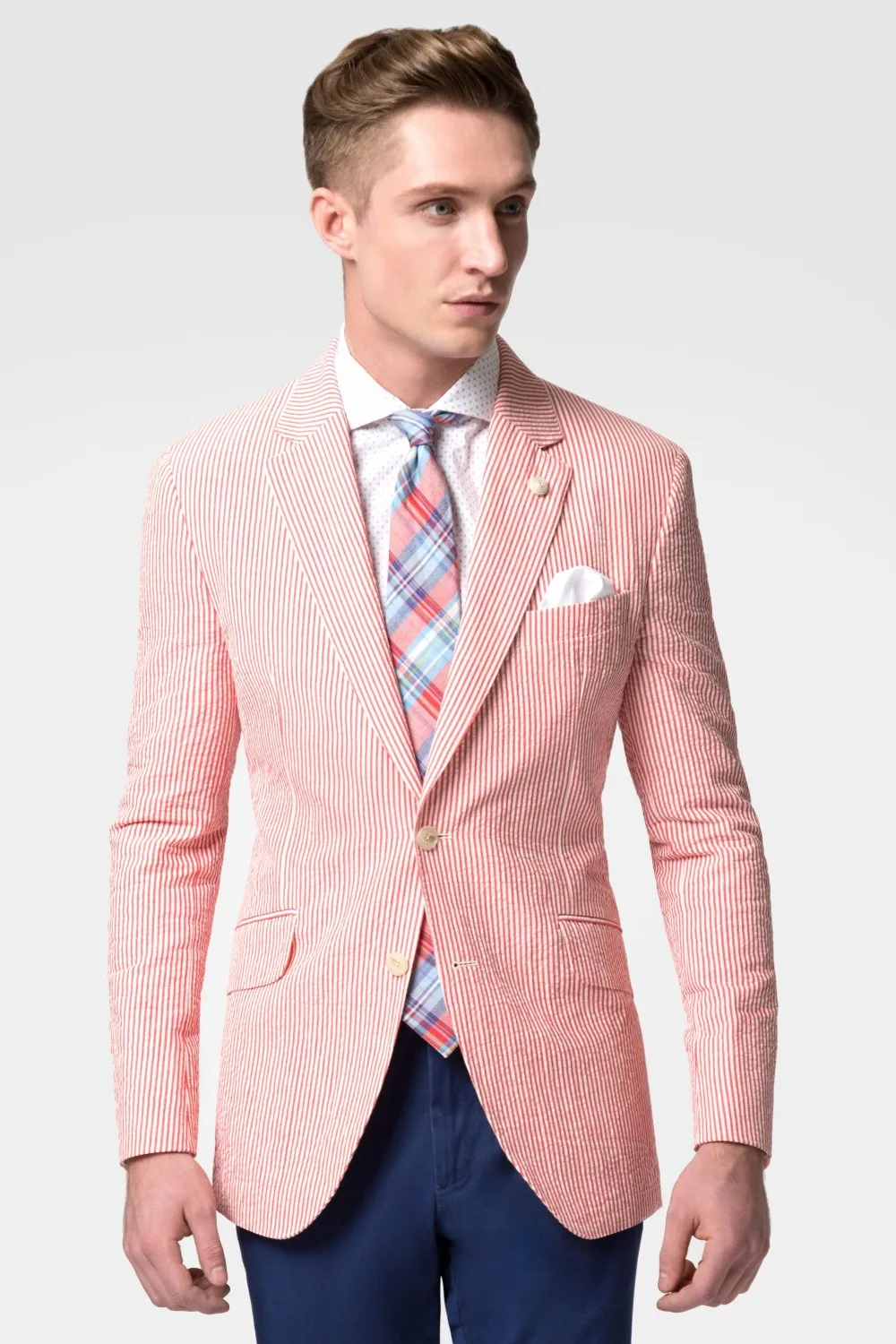 When you style the mens seersucker blazers you need not treat the much differently than you would a wool blazer or a cotton blazer. Its a light thin alternative to heavier formal fabrics with a crisp hand-feel whose name is borrowed from the word and appearance of sugarcane referencing the plants smooth and rough stripes. Sunny weather going out event - you will look stunning in your new jacket.