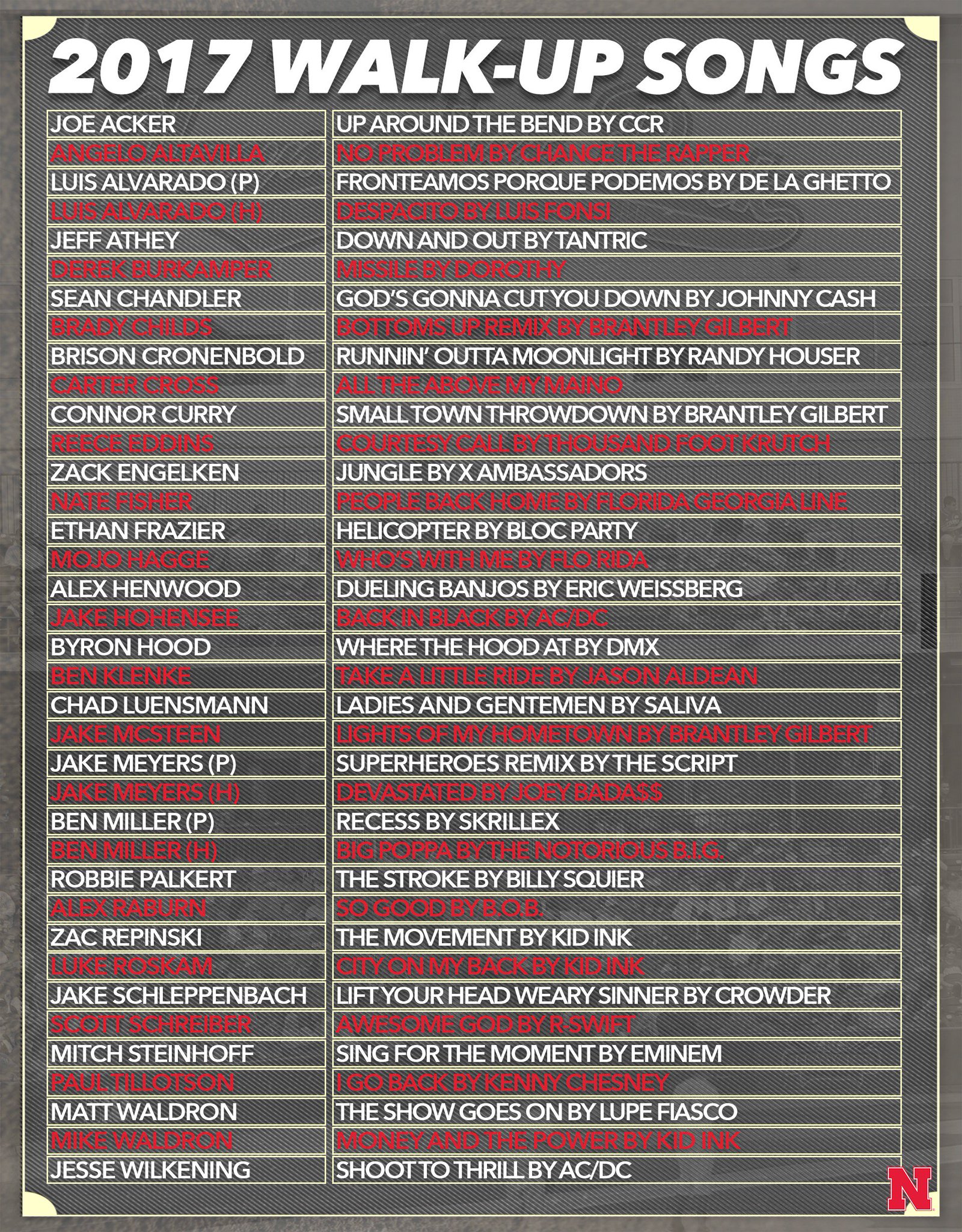 Nebraska Baseball On Twitter From Chance The Rapper To Brantley Gilbert To Dueling Banjos This Year S Walk Up Songs Https T Co Xp7k4ckkht Https T Co Peszthfipo